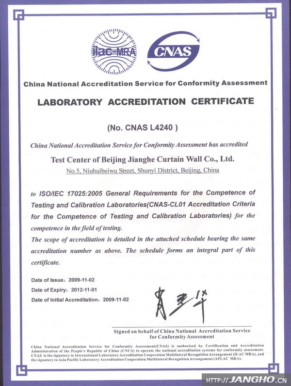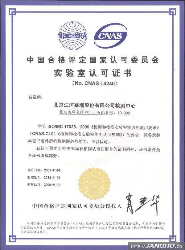 鉴黑担保网幕墙检测中心正式获得CNAS实验室资质认可证书——成为行业首家通过评审并列入国家获准实验室认可机构名录的幕墙企业